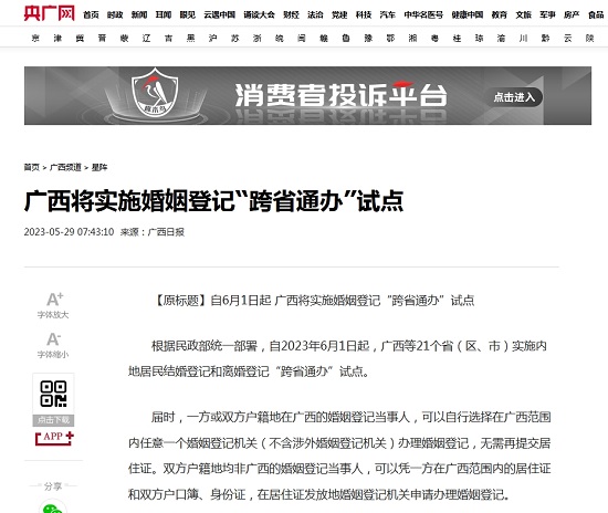 【原标题】自6月1日起 广西将实施婚姻登记“跨省通办”试点