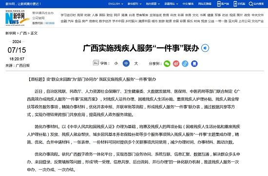 近日,自治区残联、民政厅、人力资源社会保障厅、卫生健康委、大数据发展局、医保局、中医药局等部门联合制定《广西高效办成残疾人服务“一件事”实施方案》,对残疾人证件办理、困难残疾人生活补贴、重度残疾人护理补贴、残疾人就业帮扶等政务服务事项,精简办事材料,优化并表申报、并联审批等流程,形成残疾人服务“一件事”联办表,通过数据共享等方式,实现办理结果跨部门共享应用,提高残疾人政务服务效能。