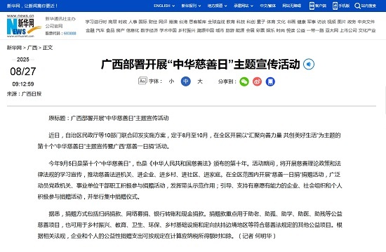 近日,自治区民政厅等10部门联合印发实施方案,定于8月至10月,在全区开展以“汇聚向善力量 共创美好生活”为主题的第十个“中华慈善日”主题宣传暨广西“慈善一日捐”活动。