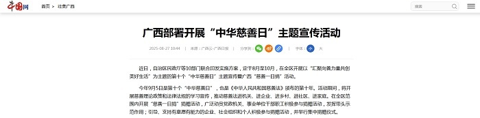 近日,自治区民政厅等10部门联合印发实施方案,定于8月至10月,在全区开展以“汇聚向善力量共创美好生活”为主题的第十个“中华慈善日”主题宣传暨广西“慈善一日捐”活动。