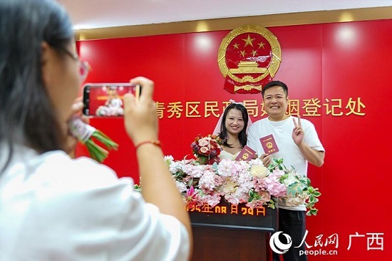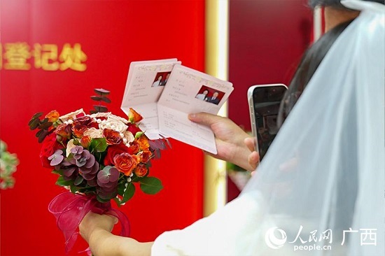新人拍摄自己的结婚证。人民网 梁章晖摄