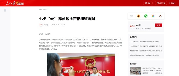 人民网南宁8月30日电 农历七月初七是中国传统的“七夕节”。8月29日,由南宁市青秀区新时代文明实践中心、南宁市青秀区民政局特别策划“我们的节日·七夕”暨暖心照相馆文明实践活动在青秀区婚姻登记处举行。活动以“时光留影·爱在七夕”为主题,为当天领证的新婚夫妻送上传统文化与文明新风交织的节日祝福。