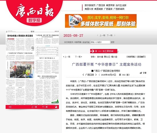本报讯 (广西云-广西日报记者何明华)近日,自治区民政厅等10部门联合印发实施方案,定于8月至10月,在全区开展以“汇聚向善力量 共创美好生活”为主题的第十个“中华慈善日”主题宣传暨广西“慈善一日捐”活动。