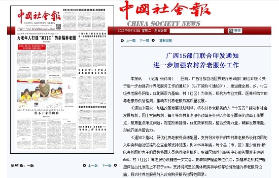 本报讯 (记者 张伟涛) 日前,广西壮族自治区民政厅等15部门联合印发《关于进一步加强农村养老服务工作的通知》(以下简称《通知》),推进健全县、乡、村三级养老服务网络,优化居家为基础、村(社区)为依托、机构为专业支撑、医养相结合的养老服务供给格局,推动农村养老服务高质量发展。