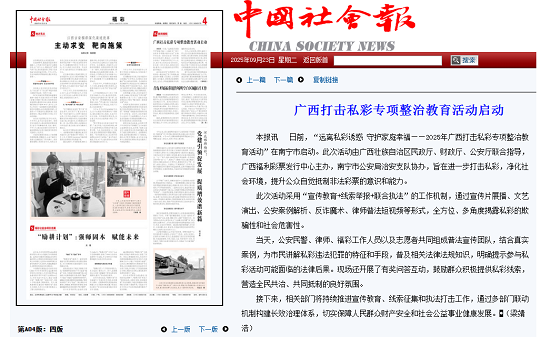 本报讯 日前,“远离私彩诱惑 守护家庭幸福——2025年广西打击私彩专项整治教育活动”在南宁市启动。此次活动由广西壮族自治区民政厅、财政厅、公安厅联合指导,广西福利彩票发行中心主办,南宁市公安局治安支队协办,旨在进一步打击私彩,净化社会环境,提升公众自觉抵制非法彩票的意识和能力。