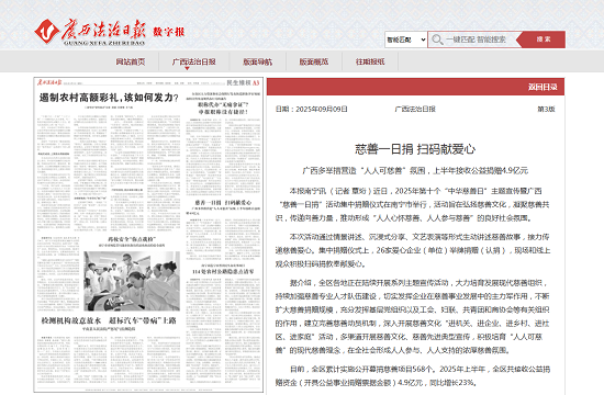 目前,全区累计实施公开募捐慈善项目568个。2025年上半年,全区共接收公益捐赠资金(开具公益事业捐赠票据金额)4.9亿元,同比增长23%。