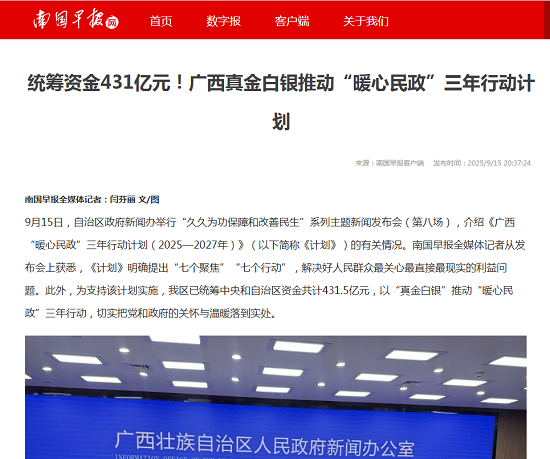 9月15日,自治区政府新闻办举行“久久为功保障和改善民生”系列主题新闻发布会(第八场),介绍《广西“暖心民政”三年行动计划(2025—2027年)》(以下简称《计划》)的有关情况。南国早报全媒体记者从发布会上获悉,《计划》明确提出“七个聚焦”“七个行动”,解决好人民群众最关心最直接最现实的利益问题。此外,为支持该计划实施,我区已统筹中央和自治区资金共计431.5亿元,以“真金白银”推动“暖心民政”三年行动,切实把党和政府的关怀与温暖落到实处。