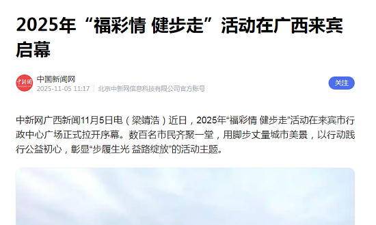 中新网广西新闻11月5日电(梁靖浩)近日,2025年“福彩情 健步走”活动在来宾市行政中心广场正式拉开序幕。数百名市民齐聚一堂,用脚步丈量城市美景,以行动践行公益初心,彰显“步履生光 益路绽放”的活动主题。