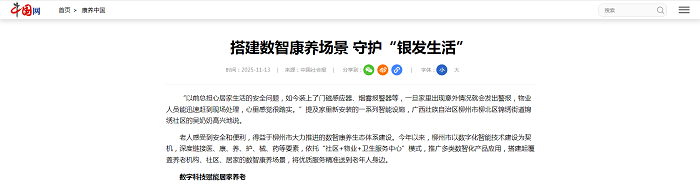 老人感受到安全和便利,得益于柳州市大力推进的数智康养生态体系建设。今年以来,柳州市以数字化智能技术建设为契机,深度链接医、康、养、护、械、药等要素,依托“社区+物业+卫生服务中心”模式,推广多类数智化产品应用,搭建起覆盖养老机构、社区、居家的数智康养场景,将优质服务精准送到老年人身边。