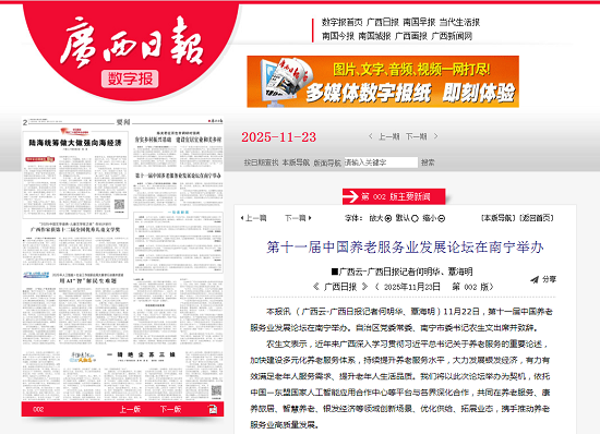 农生文表示,近年来广西深入学习贯彻习近平总书记关于养老服务的重要论述,加快建设多元化养老服务体系,持续提升养老服务水平,大力发展银发经济,有力有效满足老年人服务需求、提升老年人生活品质。我们将以此次论坛举办为契机,依托中国—东盟国家人工智能应用合作中心等平台与各界深化合作,共同在养老服务、康养旅居、智慧养老、银发经济等领域创新场景、优化供给、拓展业态,携手推动养老服务业高质量发展。