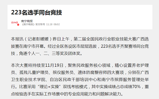 本报讯(记者彭媛媛)昨日上午,第二届全国民政行业职业技能大赛广西选拔赛在南宁市开幕。经过全区各设区市层层选拔,223名选手齐聚赛场同台竞技,角逐个人一、二、三等奖及团体奖。