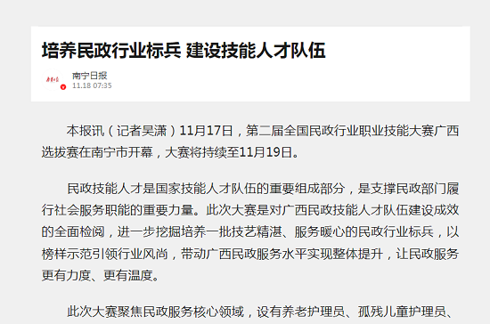 本报讯(记者吴潇)11月17日,第二届全国民政行业职业技能大赛广西选拔赛在南宁市开幕,大赛将持续至11月19日。