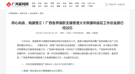 11月26日,香港新界大埔屋邨宏福苑多栋住宅楼发生火灾。香港火情始终牵动着广西各族群众及广大在港桂籍乡亲的心。灾情发生后,香港广西社团总会迅速响应,当晚即成立应急支援小组,全力配合大埔区民政事务处开展紧急救援工作。广西海外联谊会第一时间向广大理事发出援助倡议书。广西各级民政系统、慈善机构、社会组织迅速行动,第一时间发起募捐活动,一场跨越山海的爱心接力在八桂大地展开。截至目前,广西各界捐款支援香港火灾救援和善后工作,总金额已经过亿。