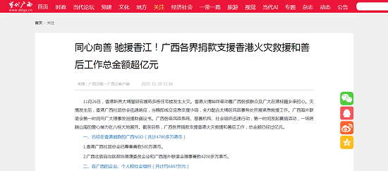 11月26日,香港新界大埔屋邨宏福苑多栋住宅楼发生火灾。香港火情始终牵动着广西各族群众及广大在港桂籍乡亲的心。灾情发生后,香港广西社团总会迅速响应,当晚即成立应急支援小组,全力配合大埔区民政事务处开展紧急救援工作。广西海外联谊会第一时间向广大理事发出援助倡议书。广西各级民政系统、慈善机构、社会组织迅速行动,第一时间发起募捐活动,一场跨越山海的爱心接力在八桂大地展开。截至目前,广西各界捐款支援香港火灾救援和善后工作,总金额已经过亿元。