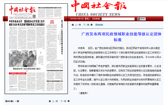本报讯 近日,由广西壮族自治区民政厅提出、自治区民政干部培训中心牵头制定的《养老护理员职业技能等级认定工作规范》《殡仪服务员职业技能等级认定工作规范》两项原创性团体标准,顺利通过专家评审并获广西标准化协会批准发布,于2025年12月18日正式实施。