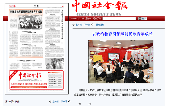 近年来,广西壮族自治区民政厅党组以习近平新时代中国特色社会主义思想为指导,全面贯彻习近平总书记关于民政工作、青年工作的重要论述以及对广西工作的重要要求,将青年政治教育引领置于突出位置,强化党对青年工作的全面领导,把青年工作纳入民政事业发展全局统筹推进,引导民政青年修好理论学习、党性锻炼、基层实践“三门课”,让青春在推进民政事业发展中焕发绚丽光彩。