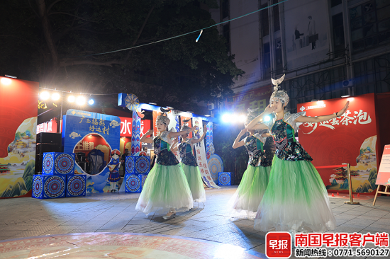 文化展演:民族舞蹈、快闪民乐等非遗节目轮番上演,巡游队伍沿十字街分发福彩特色气球,传递欢乐。