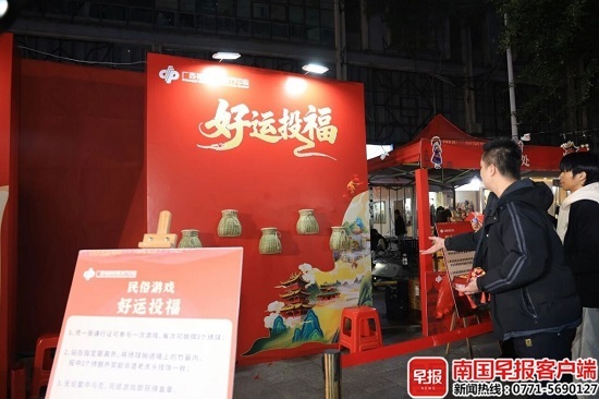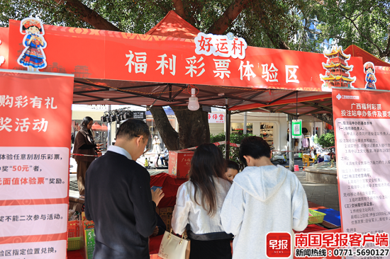 公益互动:福利彩票体验区与“好运村”互动游戏区人头攒动,市民通过“好运通行证”参与抛绣球、套圈等民俗游戏,在体验购买彩票实时公益的同时,赢取玉林牛巴、茶泡、非遗老虎头挂饰等特色奖品。