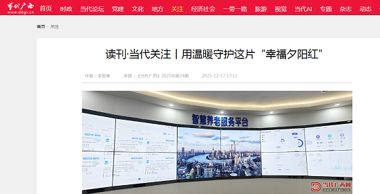 一句问候、一碗热饭、一次上门照护……见微以知萌,见端以知末。预计到2025年底,广西60岁以上老年人口将超过1000万人,占总人口比例达到20%以上。面对养老服务需求日益多元,广西持续深化养老服务改革发展,及时解决广大老年人急难愁盼,努力满足老年人多元化的养老服务需求,用温暖守护“幸福夕阳红”。