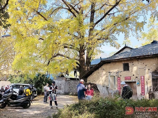 游客在广西桂林市兴安县漠川乡榜上村银杏林游玩。董金艳 摄