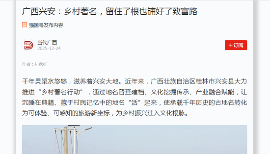 千年灵渠水悠悠,滋养着兴安大地。近年来,广西壮族自治区桂林市兴安县大力推进“乡村著名行动”,通过地名普查建档、文化挖掘传承、产业融合赋能,让沉睡在典籍、藏于村民记忆中的地名“活”起来,使承载千年历史的古地名转化为可体验、可感知的旅游新坐标,为乡村振兴注入文化根脉。