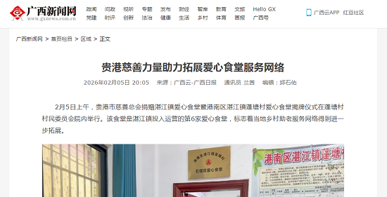 2月5日上午,贵港市慈善总会捐赠湛江镇爱心食堂暨港南区湛江镇蓬塘村爱心食堂揭牌仪式在蓬塘村村民委员会院内举行。该食堂是湛江镇投入运营的第6家爱心食堂,标志着当地乡村助老服务网络得到进一步拓展。