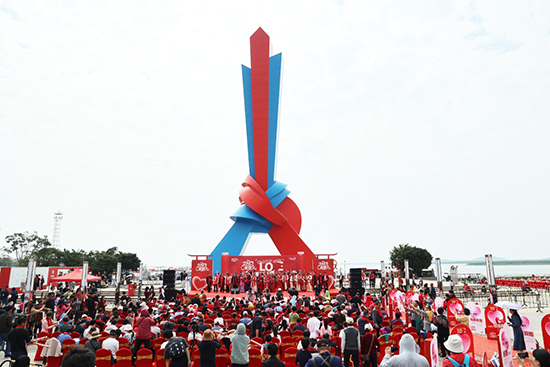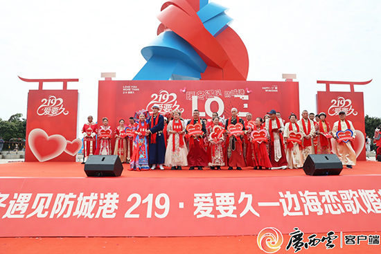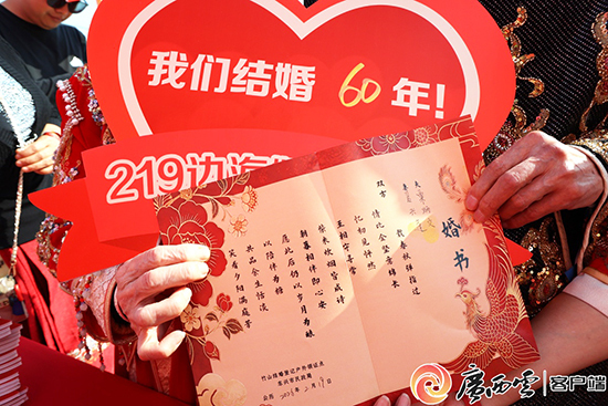 当天上午,中越界河风景区的山海相连地标广场笙歌鼎沸,来自全国各地、各民族、各行业、不同婚龄的219对夫妻代表分别签订婚书、缔结白首之约,随即携手走过“婚龄大道”,将婚书投入“未来邮筒”,寄托“青丝到白发”的绵长情意。