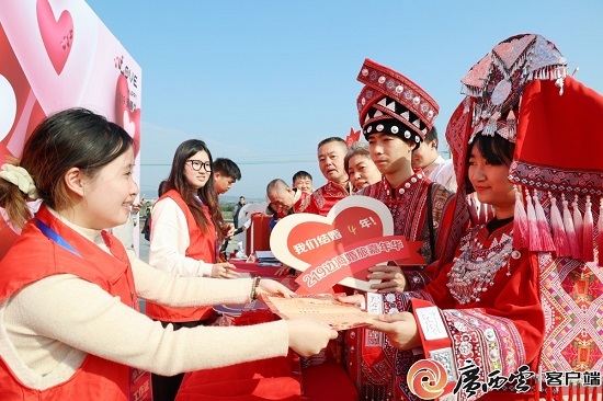 “多民族同胞聚在这里,我很开心。我们要珍惜眼前人,守护忠诚的爱情誓言,共同弘扬爱国爱家、向上向善的文明风尚。”参加活动的苗族姑娘吴尚宣说。