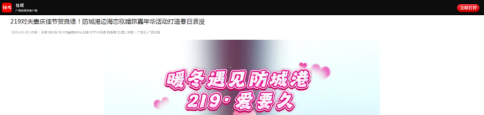 春光作序,风传花信。2月19日,东兴中越界河风景区开启春日浪漫之约:“暖冬遇见防城港219·爱要久——边海恋歌婚旅嘉年华”活动在此解锁婚旅融合新玩法,219对夫妻庆佳节、贺良缘,民俗与新潮交织的文化盛宴喜迎八方来客。