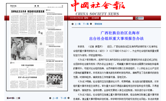 本报讯 (记者 姜雪芹) 近日,广西壮族自治区北海市民政局印发《北海市社会组织重大事项报告办法(试行)》(以下简称《办法》),为全市社会组织高质量发展划定行为准则,织密监管网络。