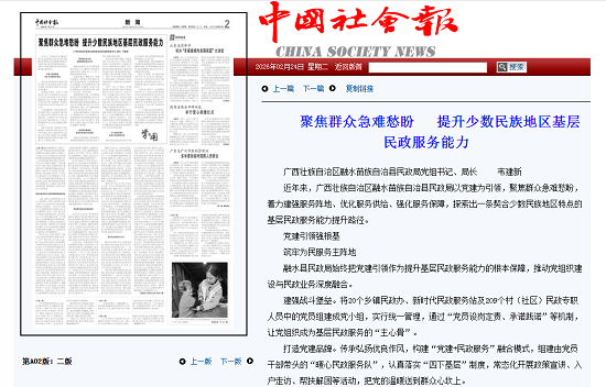近年来,广西壮族自治区融水苗族自治县民政局以党建为引领,聚焦群众急难愁盼,着力建强服务阵地、优化服务供给、强化服务保障,探索出一条契合少数民族地区特点的基层民政服务能力提升路径。