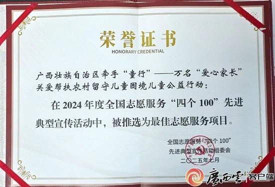 今年8月,广西牵手“童”行——万名“爱心家长”关爱帮扶农村留守儿童困境儿童公益行动,获评全国“最佳志愿服务项目”先进典型。