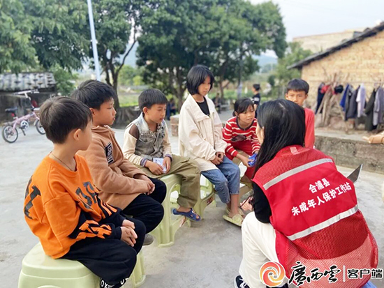 ▲合浦县未成年人保护工作站工作人员给留守儿童做情绪疏导